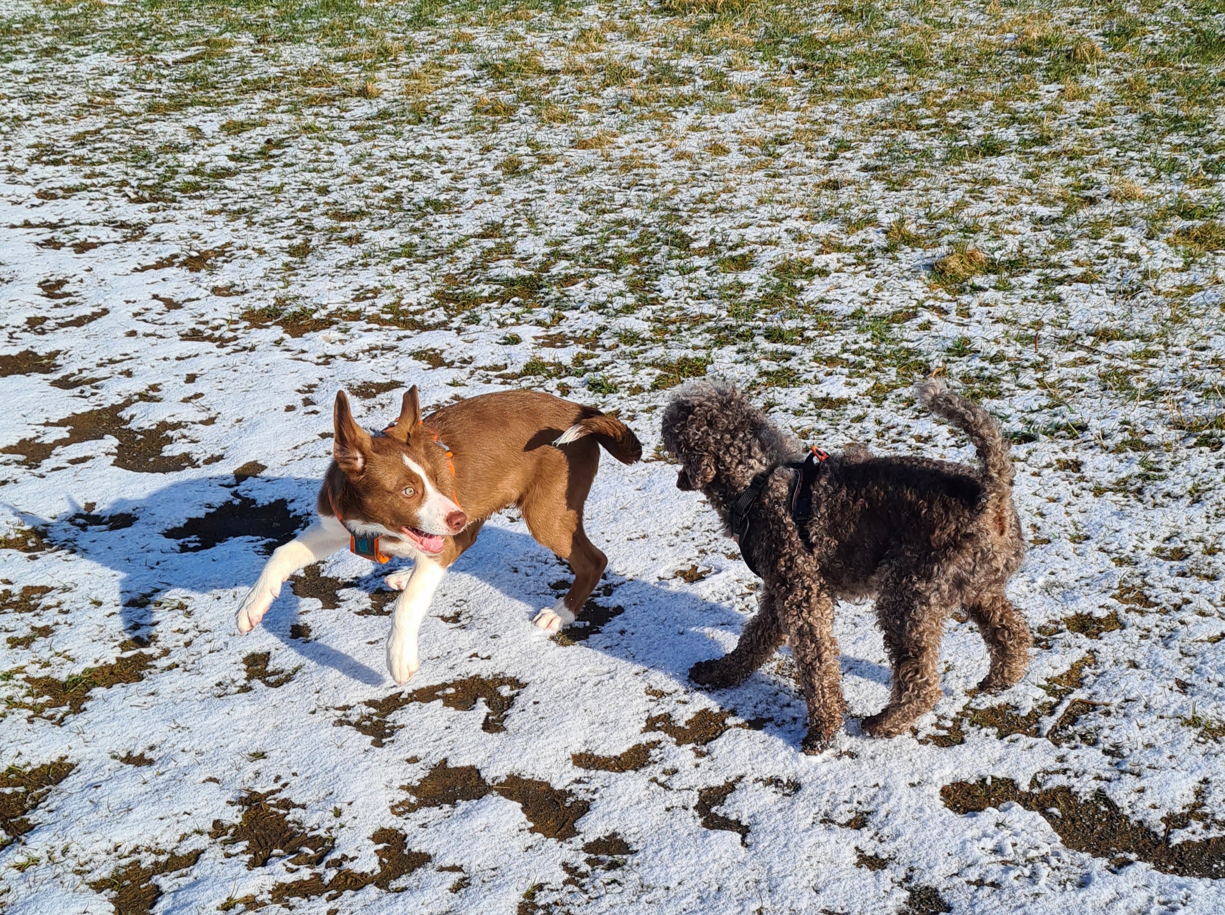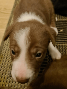 Qli har fått lekt med veldig mange hunder, både voksne og valper, han viser en veldig snill og tilbakeholdende side når han møter voksne hunder han ikke kjenner. Ellers så er han trygg og leken når han møter valper. Til høyre møter han en valp som var på besøk hos Veronika for å bli sosialisert, hun var 1 dag yngre enn Qli, men som en ser på bildet så er han ganske stor i forhold til henne.