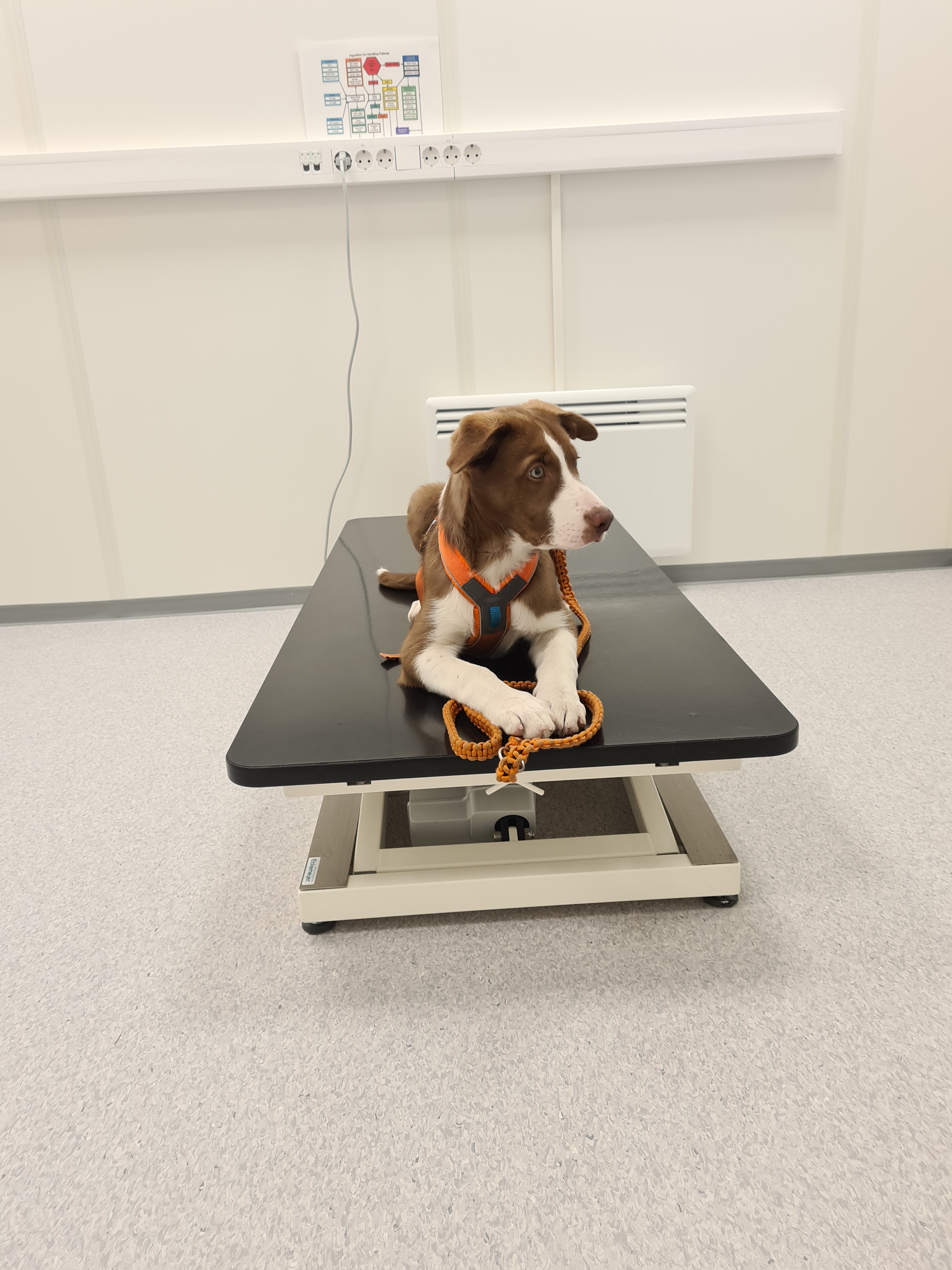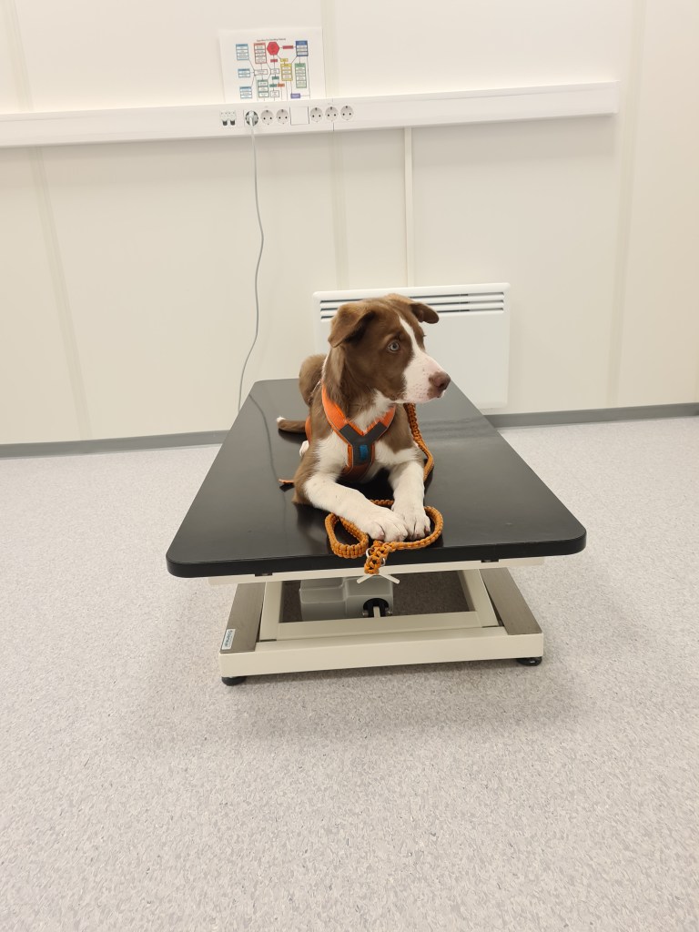 Han skulle ha en sprøyte og en nese vaksine og begge deler gikk over all forventning. Han er veldig glad i å være på bord, dette har me trent masse på hjemme også. Så at han fikk ligge på bordet og få masse godbiter fikk det med sprøyte osv til å bli noen som var langt unna hans oppmerksomhet.