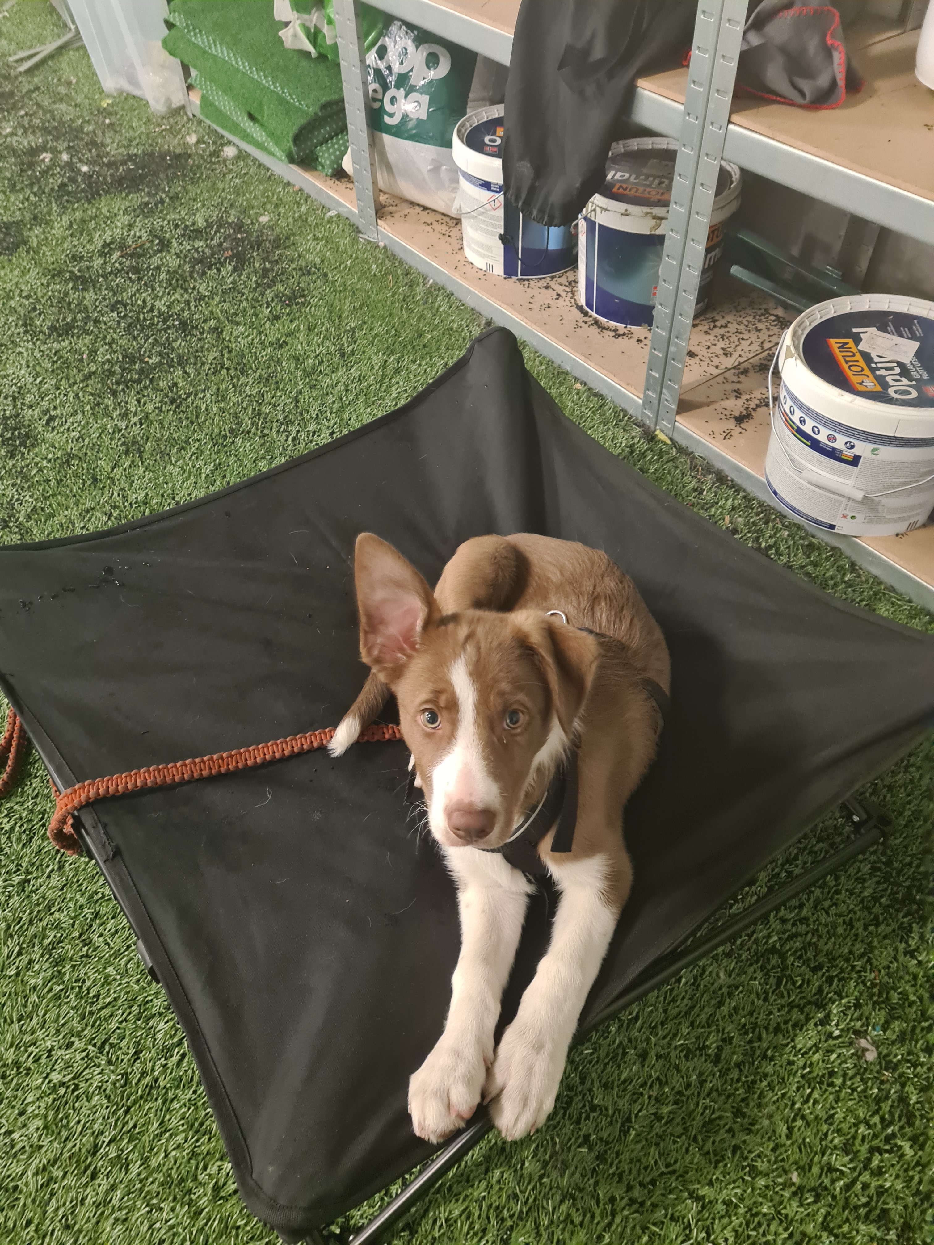 Etter det var det påske og eg kunne, selv om eg hadde vakt og jobbet hver dag kontrollere når eg startet og sluttet, sp da ble Qli alene med Luke noen timer om gangen. Eg hentet han i pauser osv. Når de er hjemme alene så overvåkes de ved hjelp av kamera. Det eg har sett er at de er veldig rolige mesteparten av tiden. Men allikevel så blir det noe tygging på sofa og masse tissing inne. Så etter litt prøving og feiling så har eg besluttet å ha han med på jobb halve dagen. Så sånn e ståa nå.